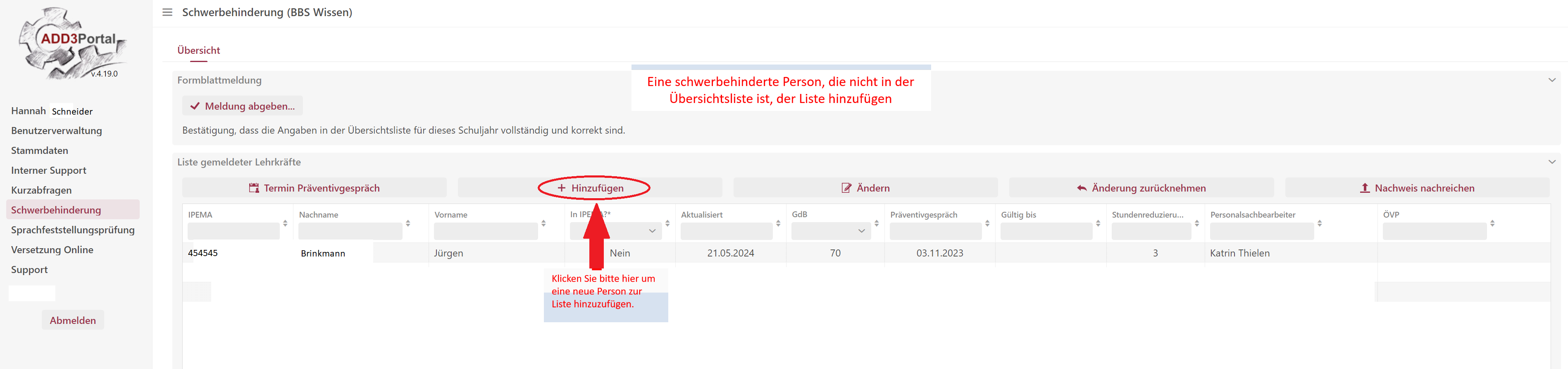 Nach Anmeldung im Modul Schwerbehinderung, können Sie direkt über den Button „+ Hinzufügen“ einen neuen Datensatz zu einer schwerbehinderten Person anlegen.