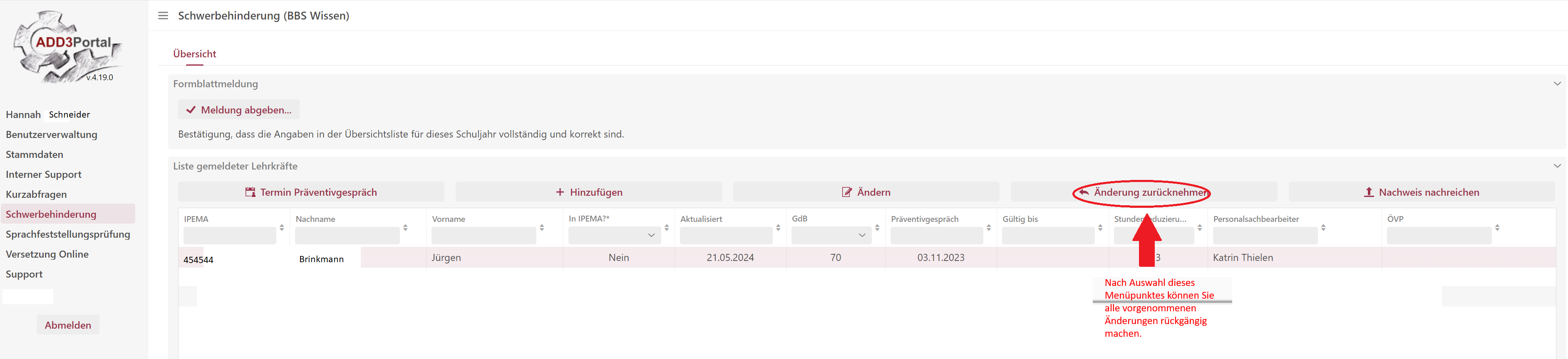 Nach Auswahl der Person, deren Daten falsch eingetragen wurden, steht Ihnen die Funktion „Änderung zurücknehmen“ zur Verfügung.