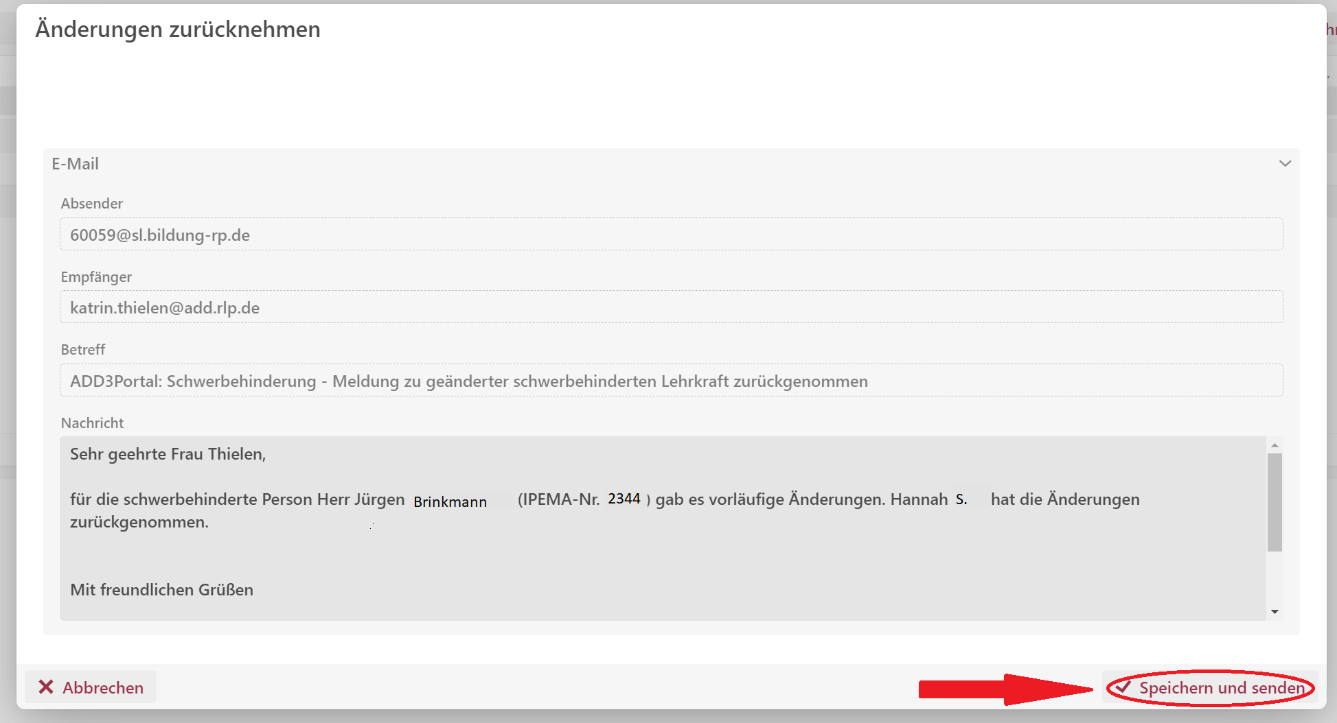 Wählen Sie die Funktion „Änderungen zurücknehmen“, müssen Sie im erscheinenden Pop-up Fenster die Wiederherstellung der alten Daten mit dem Button „Speichern und senden“ bestätigen.