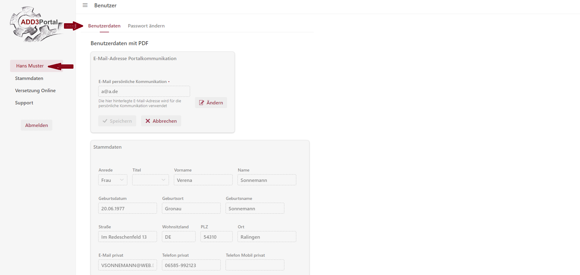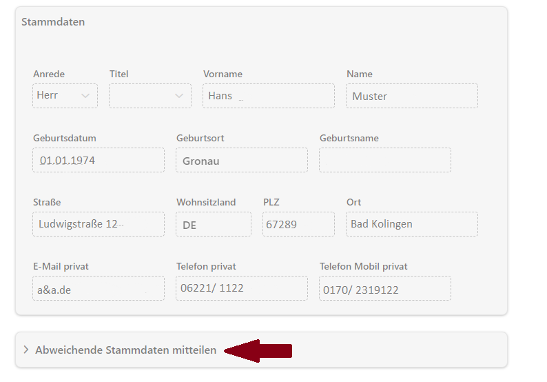 und im Reiter „Benutzerdaten“ nach unten scrollen. Dort den Menüeintrag „Abweichende Stammdaten“ anklicken.