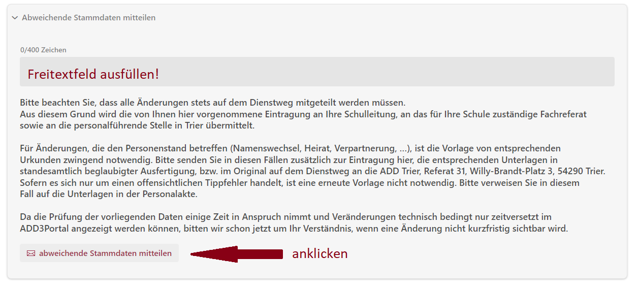 Nun können Sie im Freitextfeld Ihre Änderungen mitteilen. Wenn Sie nun auf den Button „abweichende Stammdaten mitteilen“, der sich ganz unten befindet, klicken, werden Ihre Änderungen an das Personalreferat per E-Mail mitgeteilt. Ihre Schulleitung und das für Ihre Schulleitung zuständige Fachreferat erhalten eine Kopie dieser E-Mail.